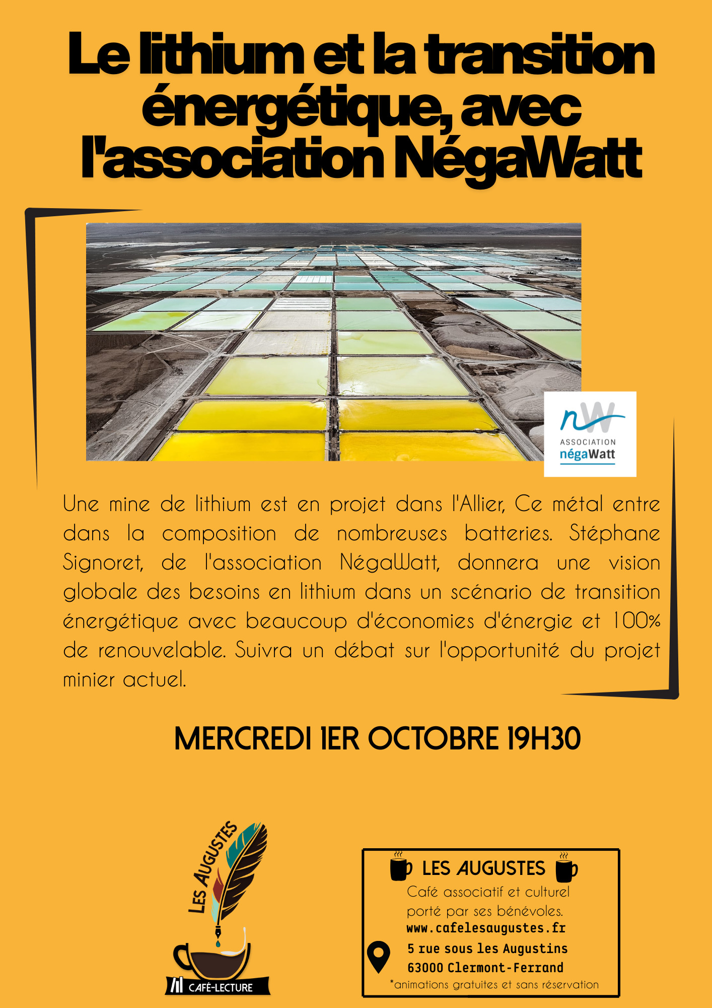 Stéphane Signoret, membre de la Compagnie des négaWatts, présentera les travaux de l’Association négaWatt pour mettre en perspective les besoins en lithium dans un scénario de transition énergétique et répondra aux questions du public.